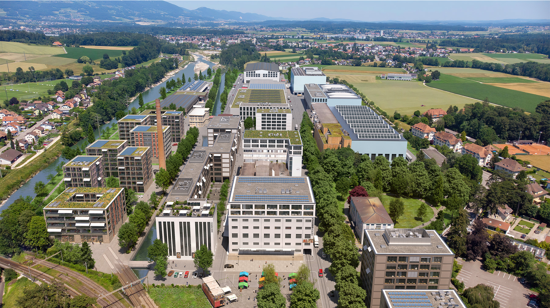 Von der Papierproduktion zur lebendigen Werk-Stadt der Zukunft: Das Papieri-Areal in Biberist wandelt sich schrittweise zu einem pulsierenden, gemischt genutzten Quartier, wo Tradition und Innovation, Nachhaltigkeit und dynamisches Gewerbe Hand in Hand gehen. Ein Kraftort, an dem sich die Pfade von Biotech-Forschern, IT-Entwicklern, Produzenten und Kunsthandwerkern kreuzen, umgeben von grünen Oasen und dem lebhaften Fluss der Emme – ein vielfältiges Mosaik aus Arbeitsplätzen, Kultur und Erholung, gestaltet mit Blick auf ökologische Verantwortung.